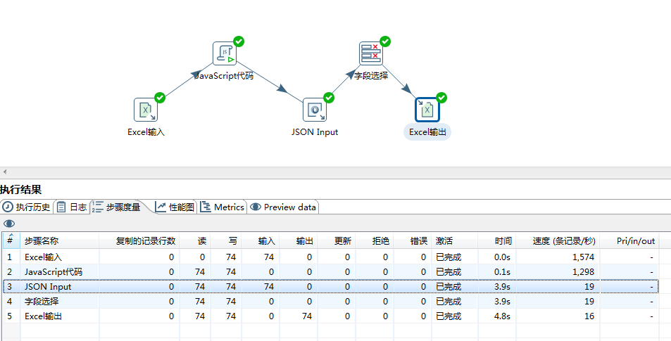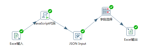 调用方法很多,Kettle调用方法如下,主要用到【JSON输入】控件,本例为简化使用excel输入和输出,改成表输入表输出也一样的